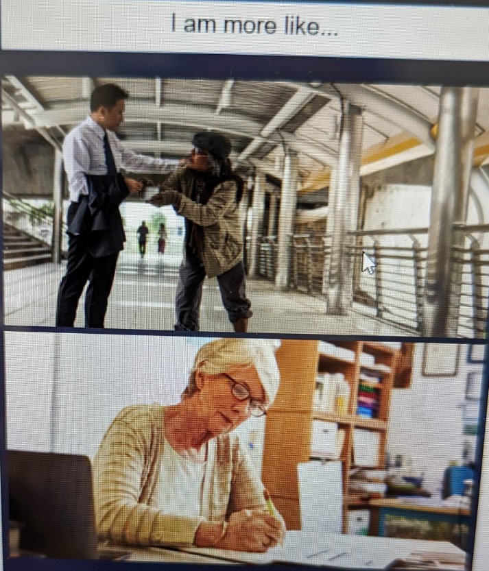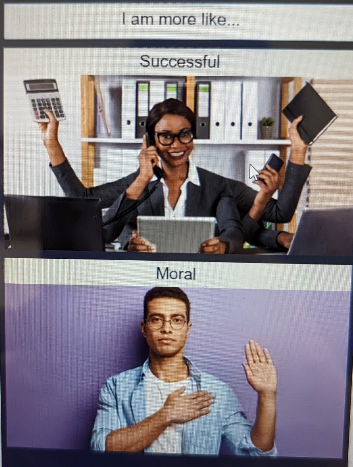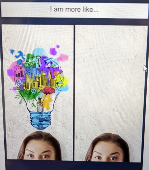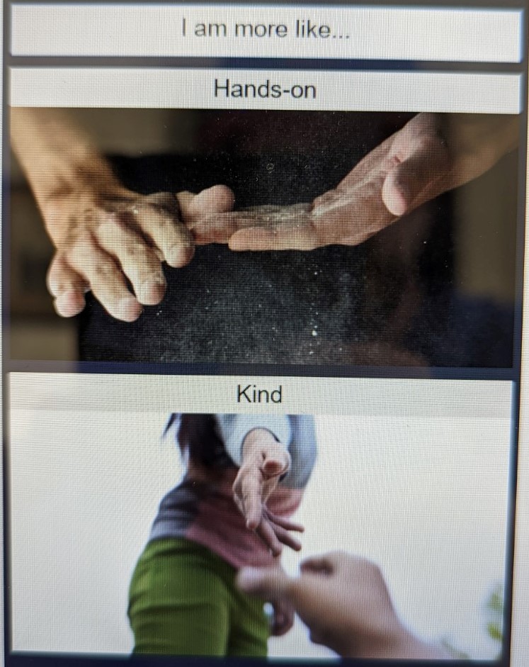 “No right or wrong answers!” the app proclaimed–a bizarre thing to say at the start of a purported game–then proceeded to present screens with two images. My task was to choose the image that is “most like me.” Soon I was off on the enviable journey of reducing my personality to a series of 56 binary choices. That’s when things got weird… and hilarious. See what I mean: